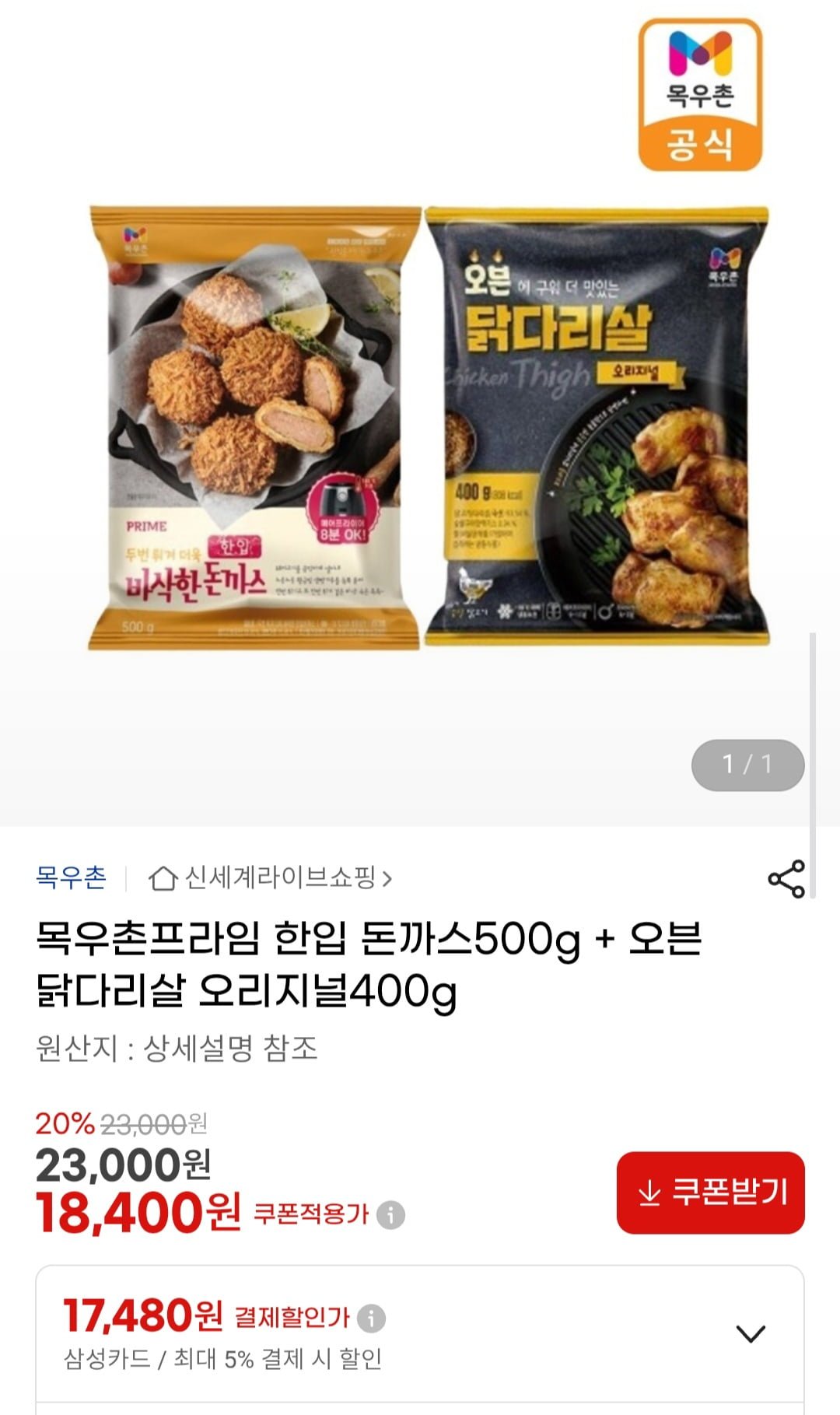 목우촌프라임 한입 돈까스500g 오븐 + 닭다리살 오리지널400g (17,480원/무배)
