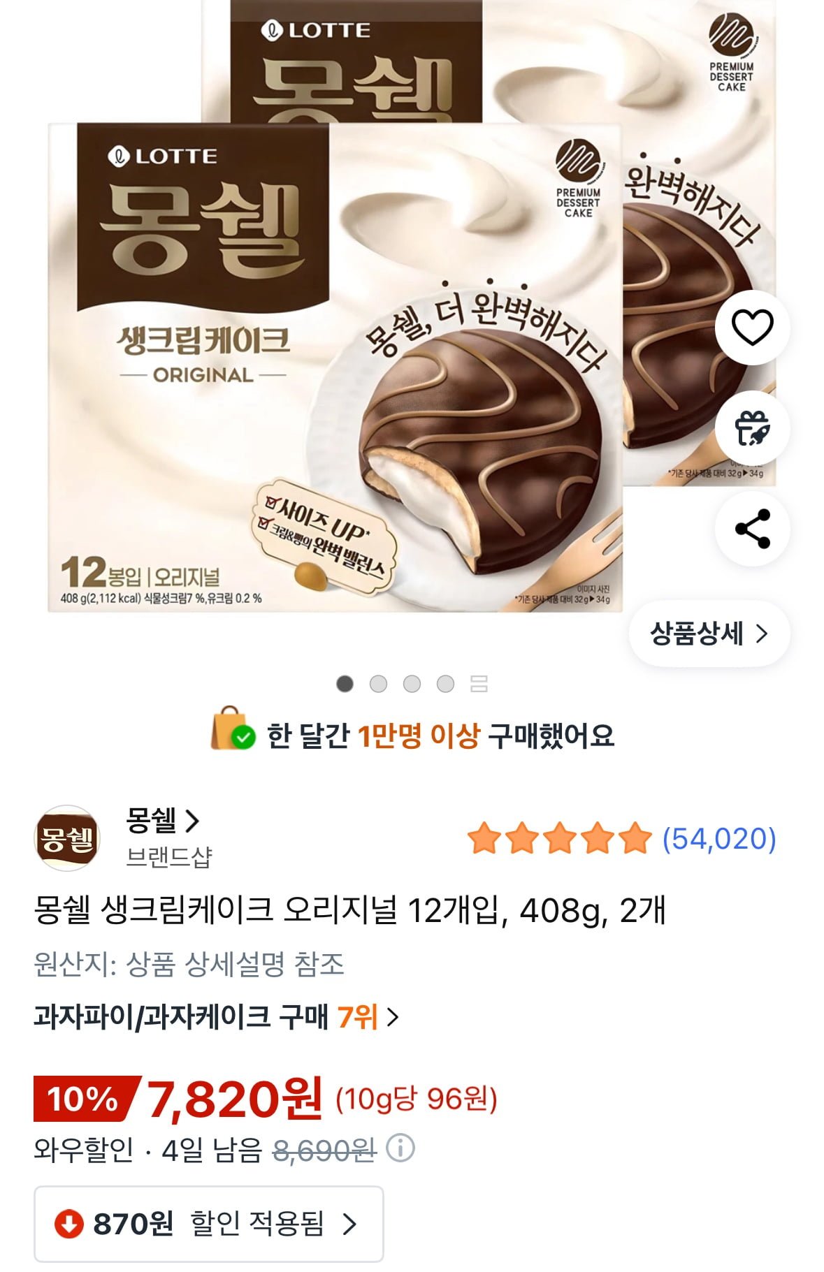 몽쉘 생크림케이크 오리지널 12개입, 408g, 2개 (7,820원/무료)