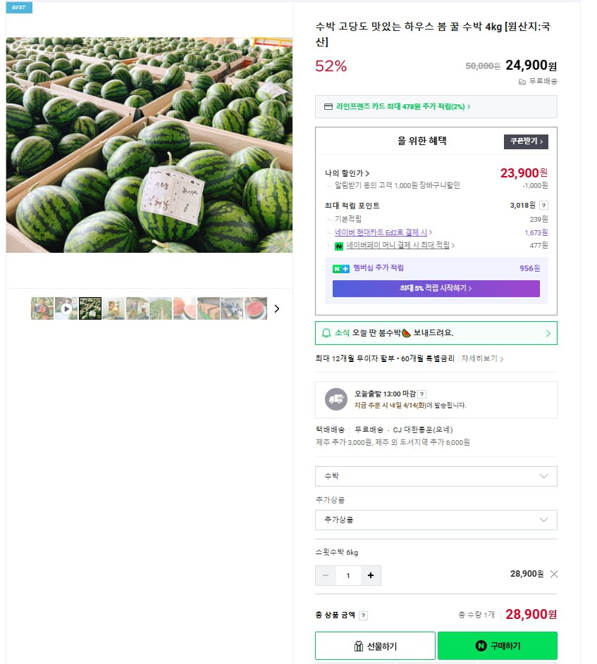 11브릭스 이상 봄수박 6kg (28,900원 / 무배)
