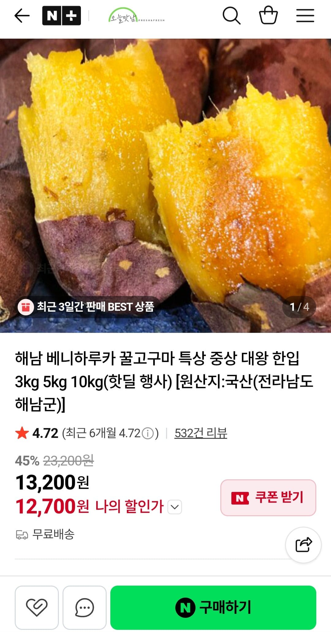 해남 베니하루카 꿀고구마 5kg (12,700원/무료)